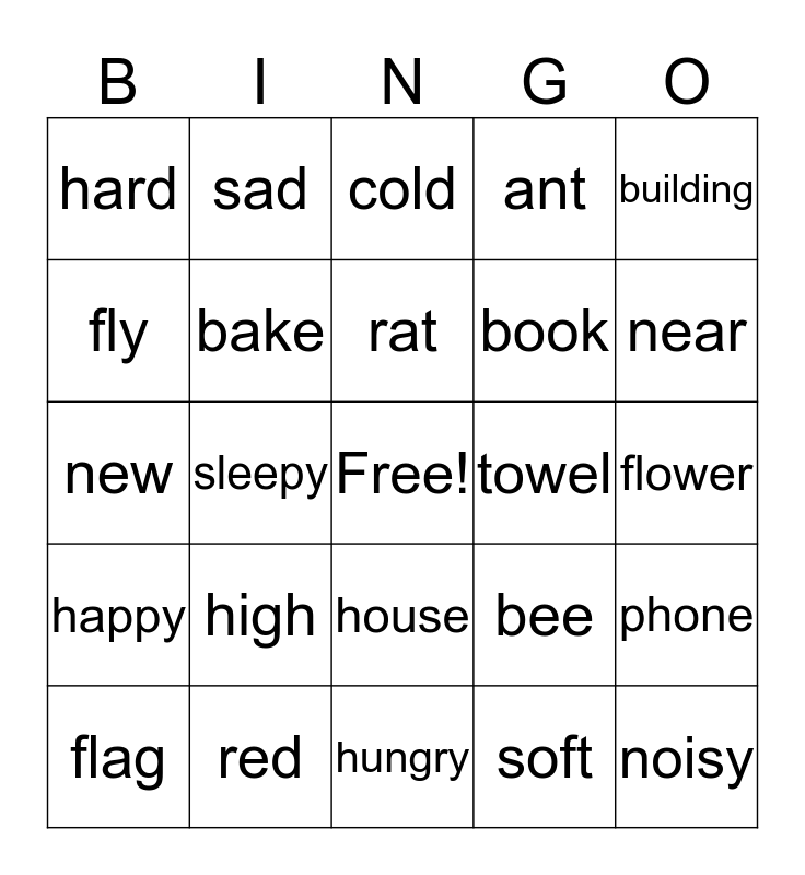 This bingo card has a free space and 54 words: dog, happy, star, garden, house, zebra, ant, tired, fly, clock, hard, new, red, flag, horse, hungry, noisy, book, scissors, flower, bee, rice, towel, building, orange, sad, busy, computer, water, soft, storm, rain, wind, hot, cold, old, new, phone, string, bake, cake, ear, nose, eyes, high, low, big, huge, rat, sleepy, near, far, round and square.