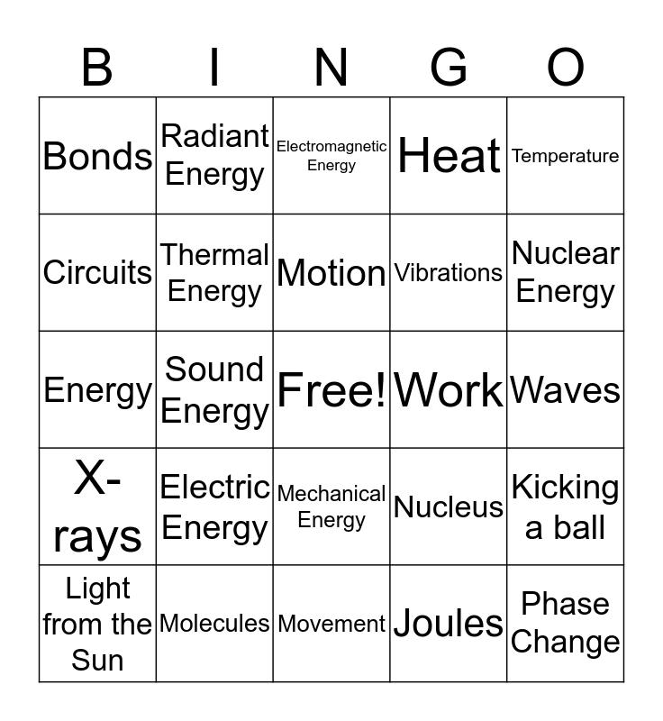 This bingo card has a free space and 26 words: Mechanical Energy, Joules, Motion, Molecules, Temperature, Bonds, Circuits, Radiant Energy, Waves, Nucleus, Vibrations, Energy, Kicking a ball, Light from the Sun, Sound Energy, Food, Heat, X-rays, Electromagnetic Energy, Phase Change, Nuclear Energy, Movement, Work, Electric Energy, Thermal Energy and Chemical Energy.
