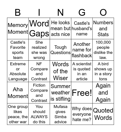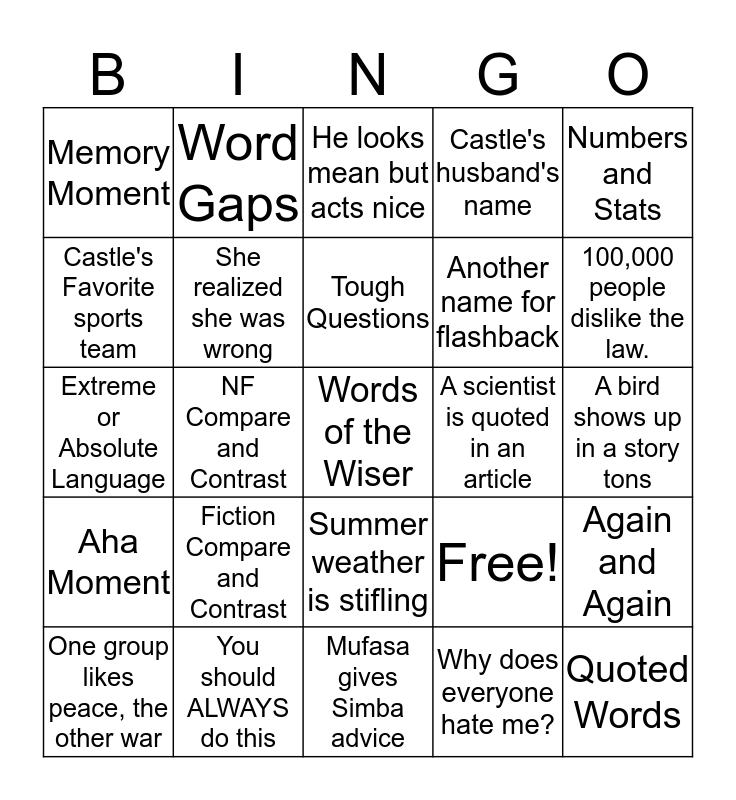 This bingo card has 25 words: Fiction Compare and Contrast, Mufasa gives Simba advice, Tough Questions, One group likes peace, the other war, Numbers and Stats, Memory Moment, Castle's Favorite sports team, Word Gaps, A scientist is quoted in an article, Summer weather is stifling, Another name for flashback, Extreme or Absolute Language, Free!, Again and Again, She realized she was wrong, Quoted Words, A bird shows up in a story tons, He looks mean but acts nice, 100,000 people dislike the law., NF Compare and Contrast, Words of the Wiser, You should ALWAYS do this, Aha Moment, Castle's husband's name and Why does everyone hate me?.