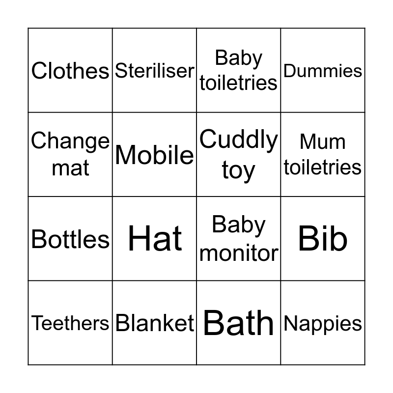 This bingo card has 16 words: Blanket, Bib, Baby toiletries, Clothes, Bottles, Steriliser, Baby monitor, Bath, Change mat, Mobile, Teethers, Dummies, Hat, Mum toiletries, Cuddly toy and Nappies.