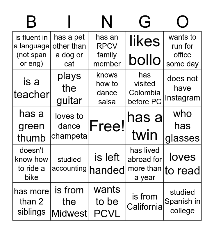 This bingo card has a free space and 24 words: studied accounting, is from the Midwest, knows how to dance salsa, has more than 2 siblings, wants to run for office some day, is fluent in a language (not span or eng), is a teacher, has a pet other than a dog or cat, has a twin, is left handed, has visited Colombia before PC, has a green thumb, has lived abroad for more than a year, loves to read, plays the guitar, is from California, who has glasses, has an RPCV family member, does not have Instagram, loves to dance champeta, studied Spanish in college, doesn't know how to ride a bike, likes bollo and wants to be PCVL.