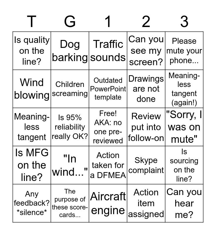 This bingo card has a free space and 24 words: "In wind...", The purpose of these score-cards..., Outdated PowerPoint template, Any feedback? *silence*, Please mute your phone..., Is quality on the line?, Wind blowing, Dog barking, Review put into follow-on, Action taken for a DFMEA, Drawings are not done, Meaning-less tangent, Skype complaint, Is sourcing on the line?, Children screaming, Action item assigned, "Sorry, I was on mute", Traffic sounds, Meaning-less tangent (again!), Is 95% reliability really OK?, Can you hear me?, Is MFG on the line?, Can you see my screen? and Aircraft engine.