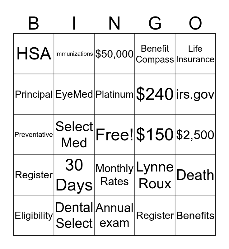 This bingo card has a free space and 36 words: Select Health, UCAS, July 1st, $240, Benefits, Eligibility, 30 Days, Adoption, Benefit Compass, Beneficiary, Register, Select Med, Deductible, $2,500, Preventative, Immunizations, Annual exam, $150, irs.gov, HSA, Dental Select, Platinum, Lynne Roux, 2 Cleanings, 2 Exams, EyeMed, $50,000, Benefit Specialist, Life Insurance, Principal, Health Equity, Monthly Rates, Register, Death, Marriage and Co-pay.