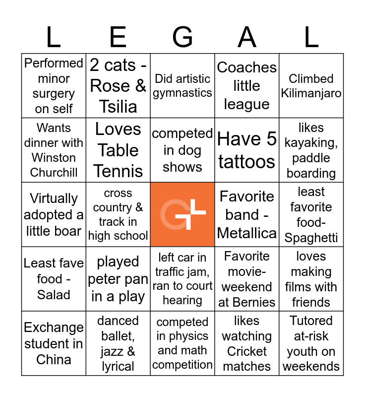 This bingo card has a free space and 24 words: played peter pan in a play, danced ballet, jazz & lyrical, competed in dog shows, Exchange student in China, Climbed Kilimanjaro, Performed minor surgery on self, Wants dinner with Winston Churchill, 2 cats - Rose & Tsilia, Favorite band - Metallica, left car in traffic jam, ran to court hearing, Have 5 tattoos, Virtually adopted a little boar, Favorite movie- weekend at Bernies, loves making films with friends, Loves Table Tennis, likes watching Cricket matches, least favorite food- Spaghetti, Did artistic gymnastics, likes kayaking, paddle boarding, cross country & track in high school, Tutored at-risk youth on weekends, Least fave food - Salad, Coaches little league and competed in physics and math competition.