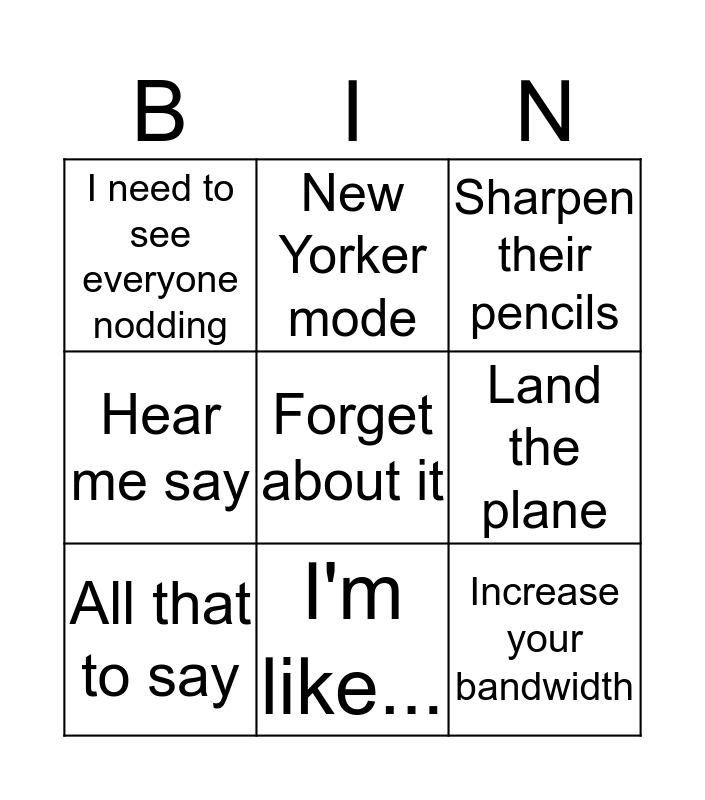 This bingo card has 9 words: All that to say, Forget about it, Sharpen their pencils, I need to see everyone nodding, New Yorker mode, Land the plane, Hear me say, I'm like... and Increase your bandwidth.