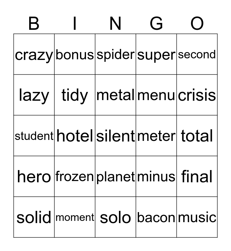 This bingo card has a free space and 24 words: frozen, moment, metal, solid, second, crazy, lazy, bonus, meter, planet, menu, student, minus, final, tidy, bacon, total, spider, crisis, hotel, music, hero, super and solo.