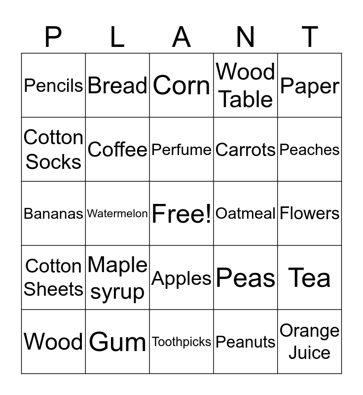 This bingo card has a free space and 24 words: Maple syrup, Gum, Perfume, Wood, Paper, Pencils, Cotton Socks, Bread, Oatmeal, Apples, Carrots, Bananas, Peas, Tea, Coffee, Peanuts, Flowers, Corn, Peaches, Watermelon, Orange Juice, Cotton Sheets, Wood Table and Toothpicks.