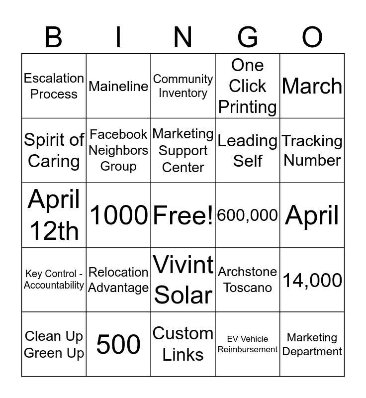 This bingo card has a free space and 28 words: 14,000, 30, Leading Self, EV Vehicle Reimbursement, Spirit of Caring, Community Inventory, Maineline, Key Control - Accountability, 600,000, Clean Up Green Up, April 12th, One Click Printing, 500, Custom Links, Tracking Number, 8th, Relocation Advantage, Facebook Neighbors Group, Marketing Support Center, Vivint Solar, Escalation Process, 72, Marketing Department, 1000, April, Archstone Toscano, March and Ridge at Wheatland.