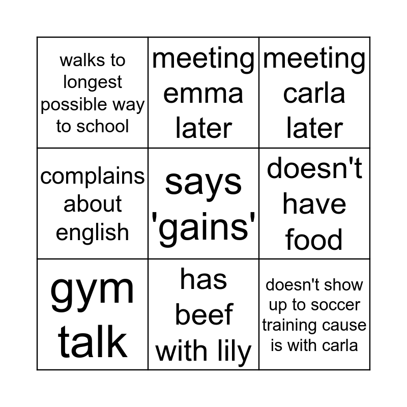 This bingo card has a free space and 8 words: doesn't have food, meeting carla later, meeting emma later, gym talk, walks to longest possible way to school, doesn't show up to soccer training cause is with carla, complains about english and has beef with lily.