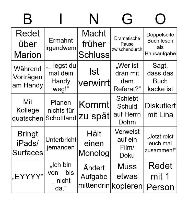 This bingo card has a free space and 30 words: „Ich bin von _ bis _ nicht da.“, Bundestagsgeld kommt nicht, Planen nichts für Schottland, Ermahnt Vicki, Redet über Marion, Macht früher Schluss, „_ legst du mal dein Handy weg!“, Hält einen Monolog, Schiebt Schuld auf Herrn Dohm, Ändert Aufgabe mittendrin, Diskutiert mit Lina, Redet mit 1 Person, Muss etwas kopieren, Fragt nach Entschuldigungen, Sagt, dass das Buch kacke ist, Holt/ Hat Kaffee, Verweist auf ein Film/ Doku, Bringt iPads/ Surfaces, Unterbricht jemanden, Doppelseite Buch lesen als Hausaufgabe, Mit Kollege quatschen, „Lest S. _!“, Ermahnt irgendwem, „Wer ist dran mit dem Referat?“, Während Vorträgen am Handy, Dramatische Pause zwischendurch, „Jetzt reist euch mal zusammen!“, „EYYYY“, Ist verwirrt and Stellt Frage, bekommt keine Antwort.