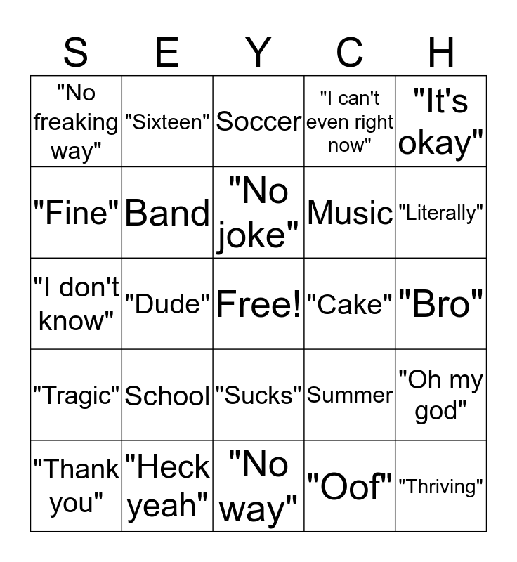 This bingo card has a free space and 29 words: "Thank you", "You've GOT to be kidding me", "Dude", "I want to die", "No freaking way", Soccer, Band, School, "Cake", "Heck yeah", "Bro", "Thriving", "No way", "Oof", "Literally", "Like", "Sucks", "Tragic", "It's okay", "I don't know", Summer, Movies, Music, "Fine", "I can't even right now", "Sixteen", "Oh my god", "No joke" and "No!".