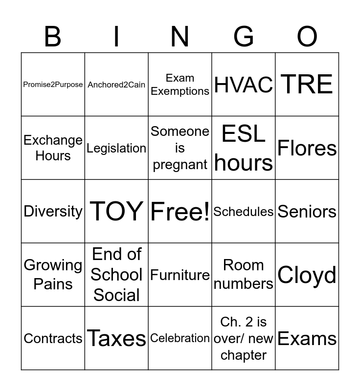 This bingo card has a free space and 34 words: Giving out roses, Ch. 2 is over/ new chapter, Hallway Presence, Puns, Growing Pains, Legislation, TRE, Contracts, Anchored2Cain, Social Media, Someone is pregnant, Exam Exemptions, Dead Week/ Exams, Top Golf, Schedules, Flores, Taxes, Diversity, End of School Social, Room numbers, Furniture, EOCs in legislation, Promise2Purpose, Seniors, Celebration, Exams, HVAC, EMPOWER, ESL hours, Exchange Hours, ____ is leaving us, TOY, Cloyd and Laptops.
