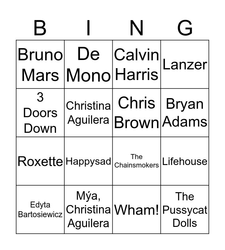 This bingo card has 37 words: Free!, Kazik, Jason Derulo, Chris Brown, Ariana Grande, Taio Cruz, Bryan Adams, Snow Patrol, 3 Doors Down, Linkin Park, Lifehouse, Lanzer, Edyta Bartosiewicz, Wham!, Christina Aguilera, The Pussycat Dolls, Katy Perry, Calvin Harris, Zedd, Mýa, Christina Aguilera, Bruno Mars, Happysad, The Cars, Sarsa, Laura Branigan, The Bangles, De Mono, Will Shepard, Gaba Kulka, Taylor Swift, Dean Lewis, Mikromusic, The Chainsmokers, Warrant, Bon Jovi, Roxette and George Michael.