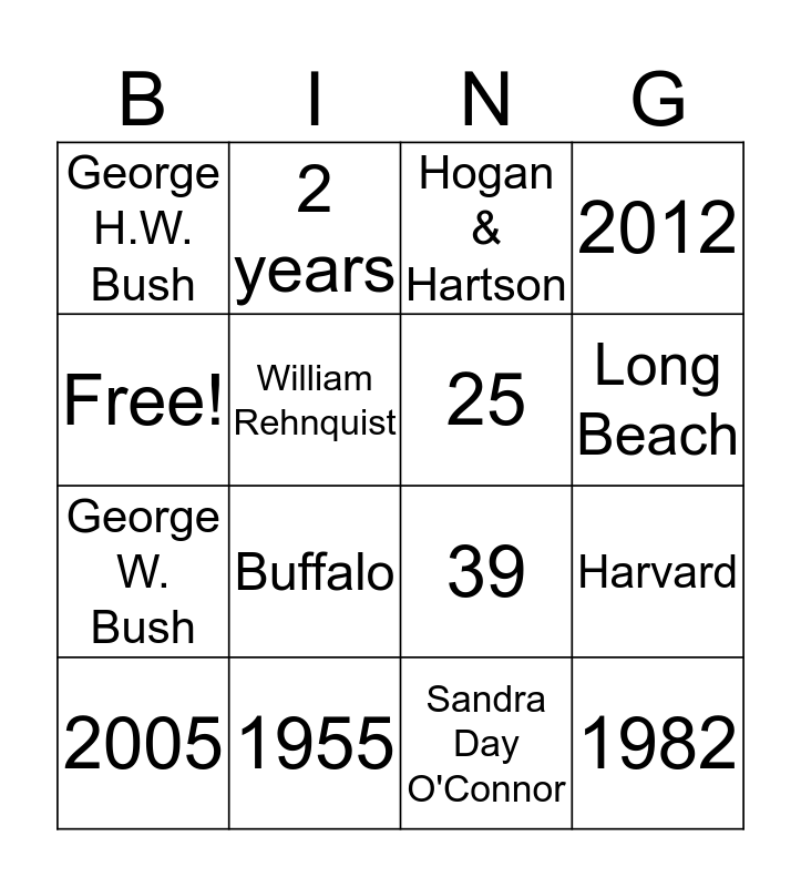 This bingo card has 16 words: 1955, Harvard, Hogan & Hartson, George H.W. Bush, George W. Bush, 2 years, 39, Sandra Day O'Connor, Free!, William Rehnquist, 2005, 2012, Buffalo, Long Beach, 25 and 1982.