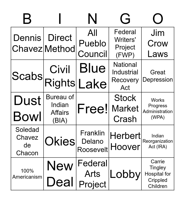 This bingo card has a free space and 34 words: Nina Otero-Waren, Lobby, Nineteenth Amendment, Ratified, Soledad Chavez de Chacon, Civil Rights, Jim Crow Laws, 100% Americanism, Direct Method, Bursum Bill, Blue Lake, All Pueblo Council, Eighteenth Amendment, Women's Christian Temperance Union (WCTU), Stock Market Crash, Great Depression, New Deal, Dust Bowl, Okies, Herbert Hoover, Franklin Delano Roosevelt, Clyde Tingley, Dennis Chavez, Works Progress Administration (WPA), Federal Arts Project, Carrie Tingley Hospital for Crippled Children, Federal Writers' Project (FWP), Civilian Conservation Corps (CCC), National Industrial Recovery Act, Scabs, United Mine Workers, Bureau of Indian Affairs (BIA), Indian Reorganization Act (IRA) and Talkies.