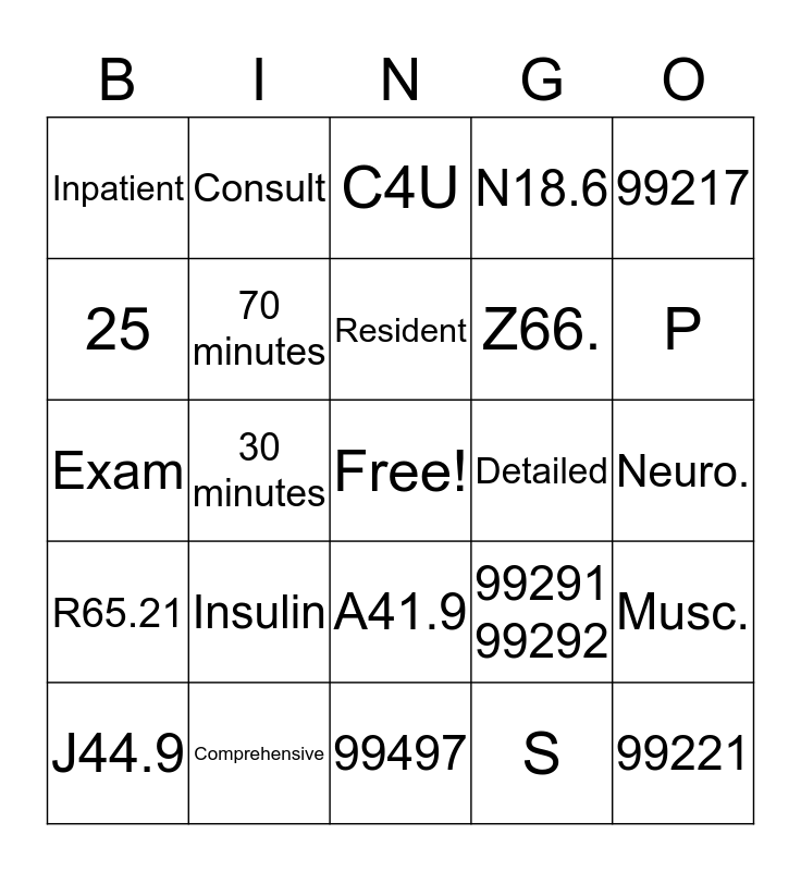 This bingo card has a free space and 29 words: J44.9, HFpEF, 30 minutes, N18.5, Inpatient, C4U, 70 minutes, Insulin, Detailed, Comprehensive, Neuro., 99221, 99497, S, P, Nurse Practitioner, A41.9, R65.21, 99217, Exam, 99291 99292, 99292 99292 x2, Z66., 25, N18.6, Consult, Musc., Resident and 59.
