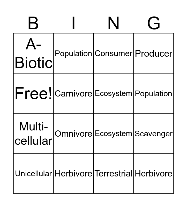 ⚠ This card has duplicate items: Biotic (2), Population (2), Food Chain (2), Herbivore (2), Ecosystem (2), A-Biotic (2), Carnivore (2), Terrestrial (2), Producer (2)
