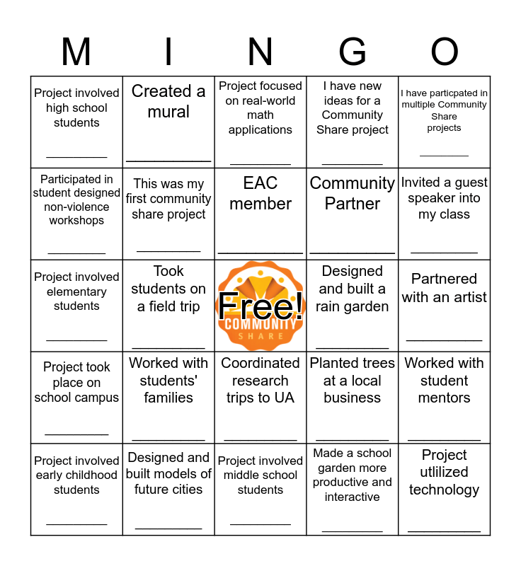 This bingo card has a free space and 24 words: Worked with students' families _________, Designed and built models of future cities _________, EAC member _________, Project involved early childhood students _________, I have particpated in multiple Community Share projects _________, Project involved high school students _________, Participated in student designed non-violence workshops _________, Created a mural _________, Designed and built a rain garden _________, Coordinated research trips to UA _________, Community Partner _________, Project involved elementary students _________, Planted trees at a local business _________, Worked with student mentors _________, This was my first community share project _________, Made a school garden more productive and interactive _________, Partnered with an artist _________, Project focused on real-world math applications _________, Invited a guest speaker into my class _________, Took students on a field trip _________, Project utlilized technology _________, Project took place on school campus _________, I have new ideas for a Community Share project _________ and Project involved middle school students _________.