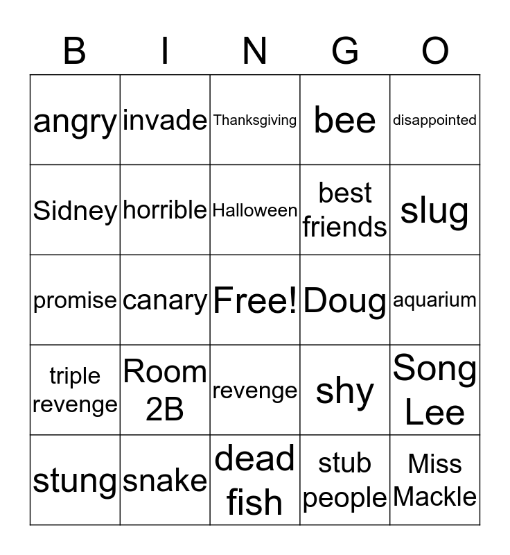 This bingo card has a free space and 24 words: Room 2B, snake, Halloween, stung, disappointed, angry, Sidney, invade, Doug, revenge, best friends, promise, shy, Song Lee, horrible, stub people, aquarium, Thanksgiving, slug, canary, Miss Mackle, triple revenge, bee and dead fish.