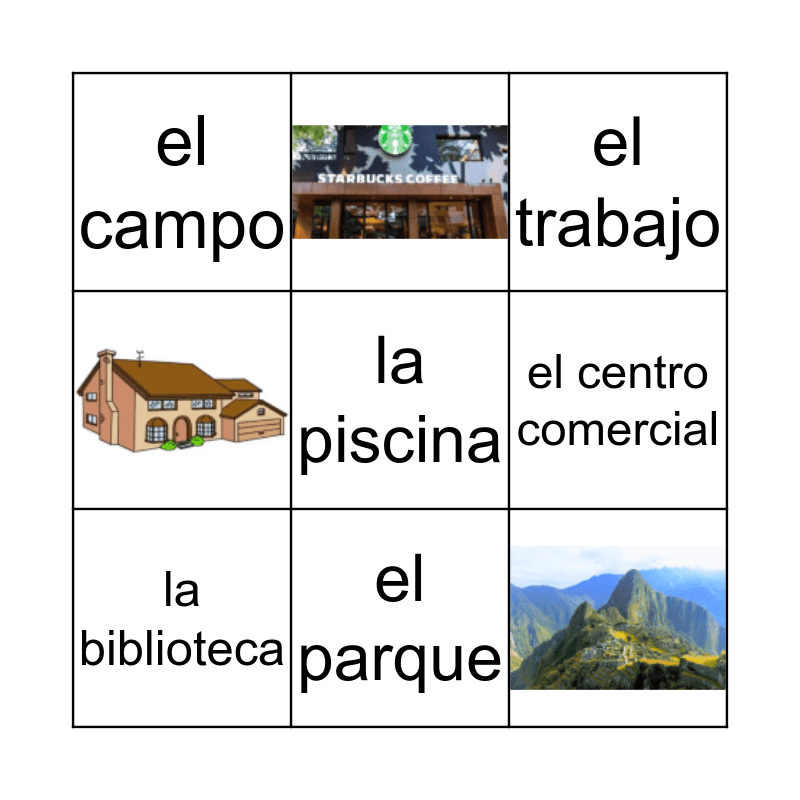 This bingo card has 3 images, a free space and 6 words: la biblioteca, el centro comercial, el campo, el trabajo, el parque and la playa.