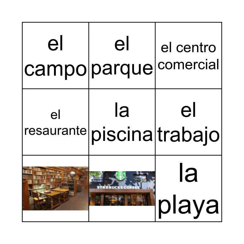 This bingo card has 3 images, a free space and 7 words: las montañas, el centro comercial, el campo, el trabajo, el parque, la playa and el resaurante.
