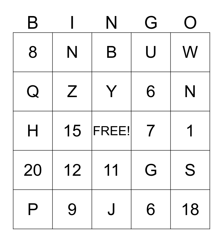 This bingo card has a free space and 24 words: 12, 9, Y, P, W, 8, Q, N, 7, 11, 6, H, G, S, Z, 6, 1, B, N, 15, 18, 20, U and J.