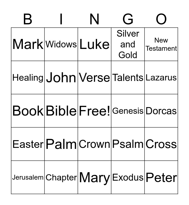 This bingo card has a free space and 31 words: Mary, Martha, Bible, Matthew, Mark, Luke, John, Psalm, Genesis, Exodus, Dorcas, Peter, Blind, Lame, Lazarus, Resurrection, Cross, Palm, Easter, Crown, New Testament, Old Testament, Jerusalem, Widows, Talents, Healing, Silver and Gold, Book, Chapter, Verse and Beatitudes.