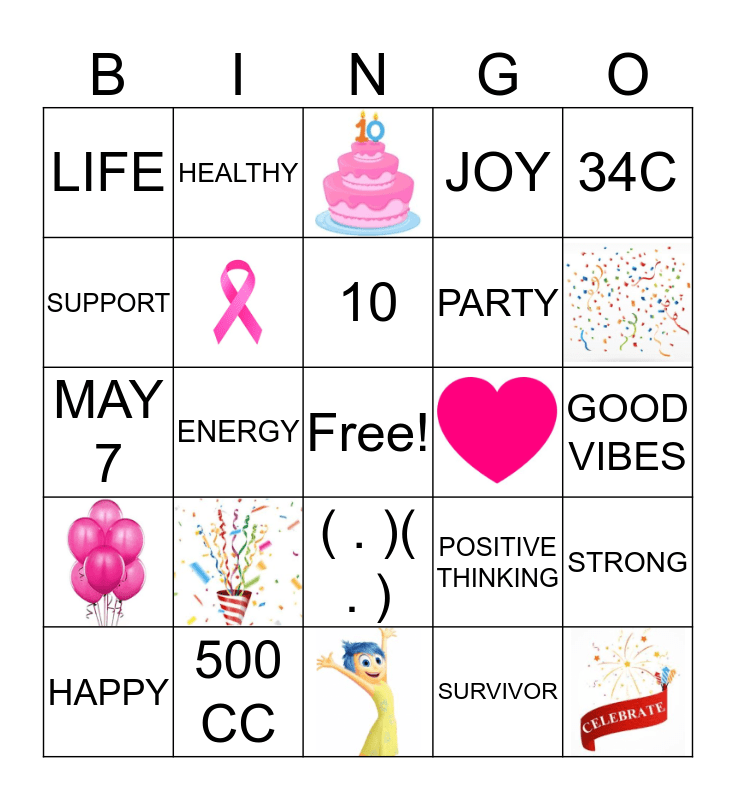 This bingo card has 9 images, a free space and 17 words: ( . )( . ), SURVIVOR, 10, 500 CC, 34C, LIFE, SUPPORT, HEALTHY, GOOD VIBES, POSITIVE THINKING, PARTY, MAY 7, STRONG, HAPPY, ENERGY, FITNESS and JOY.