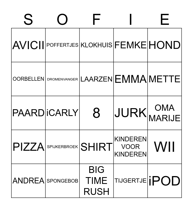 This bingo card has a free space and 57 words: AGENDA, ANDREA, ANNE, AVICII, BIG TIME RUSH, BREGJE, DROMENVANGER, ELLI GOULDING, EMMA, EVA, FEMKE, FRANK, FRIET, GIJS, GUUS MEEUWIS, HOCKEY, HOND, iCARLY, iPAD, iPOD, JURK, KATY PERRY, KINDEREN VOOR KINDEREN, KLOKHUIS, KONIJN, LAARZEN, LEGGING, MARIT, METTE, MIA, MINOU, NICK BATTLE, NOA, OLIVIA, OMA MARIJE, OORBELLEN, OPA FRANS, PAARD, PANNENKOEK, PIZZA, POFFERTJES, SHIRT, SILKE, SILVER, SOFIE, SPAGHETTI, SPIJKERBROEK, SPONGEBOB, STEPHANIE, STIFTEN, TAS, TIJGERTJE, TIM, TOP MODELS, VRIENDENBOEK, WII and ZINGEN.