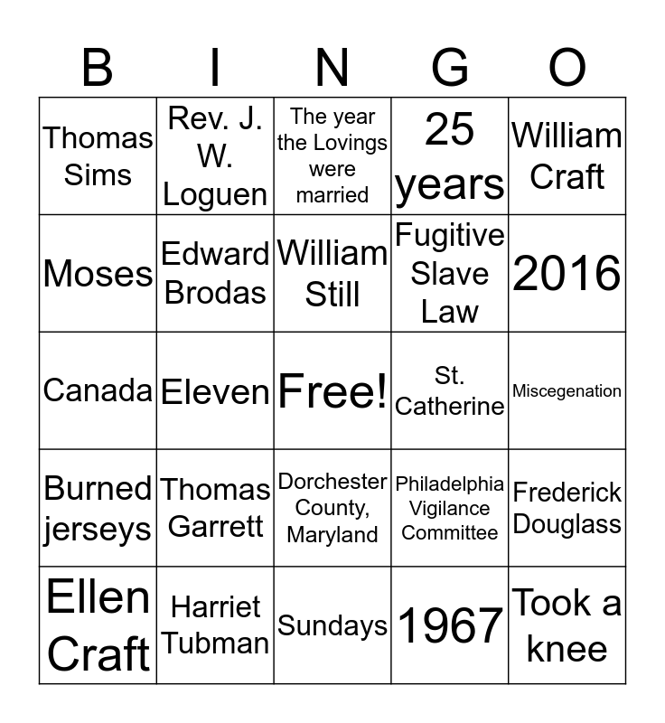 This bingo card has a free space and 24 words: Thomas Garrett, Harriet Tubman, William Still, Ellen Craft, William Craft, Thomas Sims, Moses, Rev. J. W. Loguen, St. Catherine, Dorchester County, Maryland, Fugitive Slave Law, Canada, Philadelphia Vigilance Committee, Frederick Douglass, Edward Brodas, 1967, Miscegenation, The year the Lovings were married, 2016, Eleven, Took a knee, Burned jerseys, 25 years and Sundays.