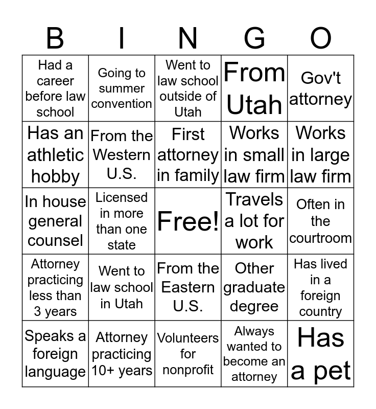 This bingo card has a free space and 24 words: Went to law school in Utah, Attorney practicing 10+ years, First attorney in family, Speaks a foreign language, Gov't attorney, Had a career before law school, Has an athletic hobby, Going to summer convention, Travels a lot for work, From the Eastern U.S., Works in small law firm, In house general counsel, Other graduate degree, Has lived in a foreign country, From the Western U.S., Always wanted to become an attorney, Often in the courtroom, Went to law school outside of Utah, Works in large law firm, Licensed in more than one state, Has a pet, Attorney practicing less than 3 years, From Utah and Volunteers for nonprofit.