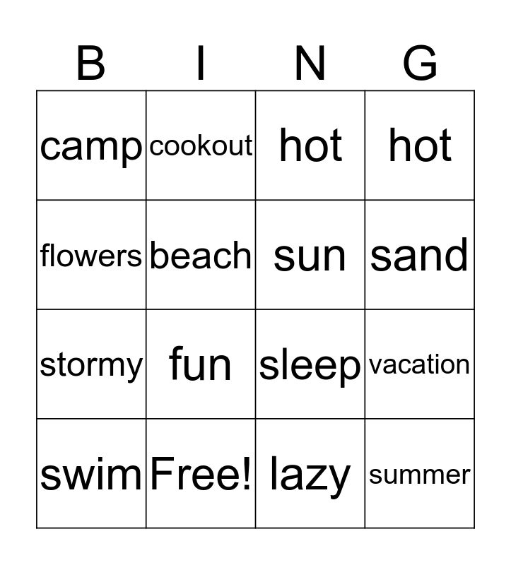 This bingo card has 16 words: Free!, vacation, hot, camp, stormy, cookout, sleep, lazy, flowers, beach, swim, hot, fun, sand, sun and summer.