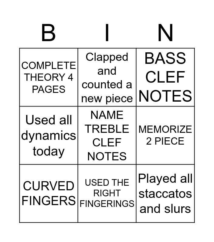 This bingo card has a free space and 11 words: PLAY 5 SONGS, SING 2 PIECE, MEMORIZE 2 PIECE, CURVED FINGERS, BASS CLEF NOTES, COMPLETE THEORY 4 PAGES, USED THE RIGHT FINGERINGS, PRACTICE 5 DAYS IN A ROW, Used all dynamics today, Clapped and counted a new piece and Played all staccatos and slurs.