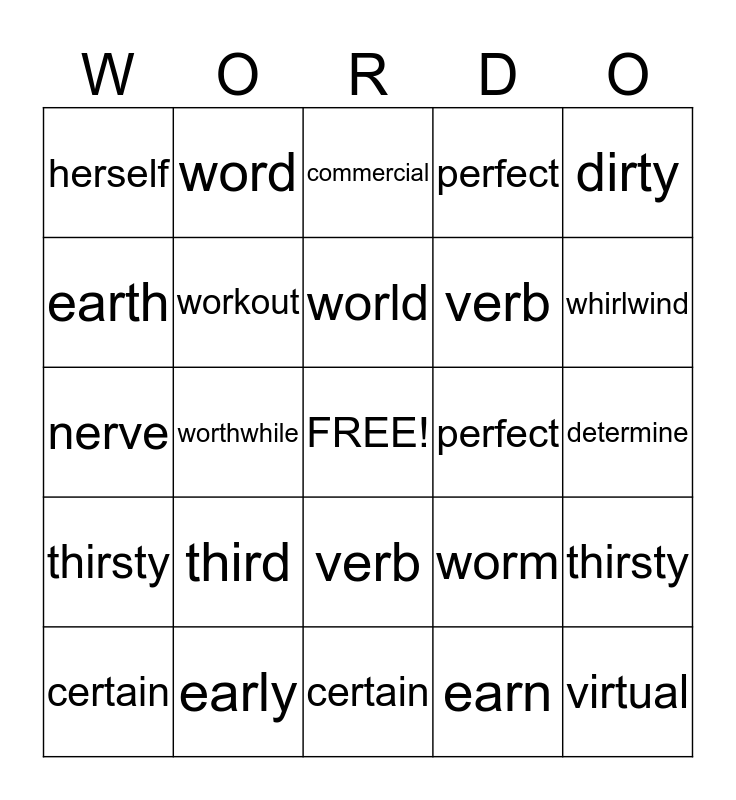 This bingo card has a free space and 24 words: third, early, world, certain, dirty, herself, earth, word, perfect, verb, verb, nerve, worm, thirsty, workout, earn, determine, commercial, whirlwind, worthwhile, virtual, thirsty, perfect and certain.