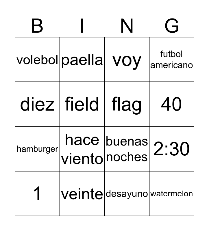 This bingo card has 60 words: melon, fish, ladder, watermelon, pitcher, sun, flag, moon, hamburger, el yogur de fresas, futbol americano, camping, field, fishing, basquetbol, volebol, 1, diez, 19, 40, veinte, voy, va, calor, verano, winter, frio, raining, hace viento, come, comen, madrid, mexico city, tacos, paella, soccer, la una de la noche, 2:30, cuatro quince, buenas noches, good morning, buenas tardes, desayuno, cena, almcrerzo, cartel, clock, mochila, pencil shrapener, desk, puerta, ventana, como estas, what is your name?, ella jueg tenis, juegan, juego, jugamos, primero and fifth.
