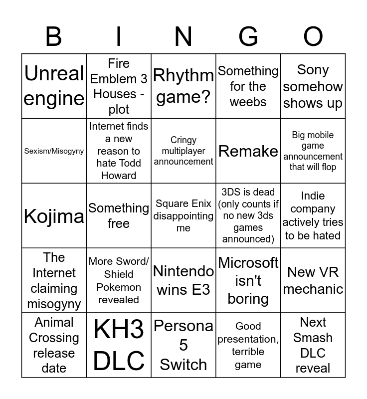 This bingo card has a free space and 24 words: Animal Crossing release date, More Sword/ Shield Pokemon revealed, Cringy multiplayer announcement, Good presentation, terrible game, Sony somehow shows up, Unreal engine, Fire Emblem 3 Houses - plot, Rhythm game?, 3DS is dead (only counts if no new 3ds games announced), Indie company actively tries to be hated, Kojima, Internet finds a new reason to hate Todd Howard, Microsoft isn't boring, New VR mechanic, Sexism/Misogyny, KH3 DLC, Persona 5 Switch, Something for the weebs, Big mobile game announcement that will flop, The Internet claiming misogyny, Something free, Nintendo wins E3, Remake and Next Smash DLC reveal.