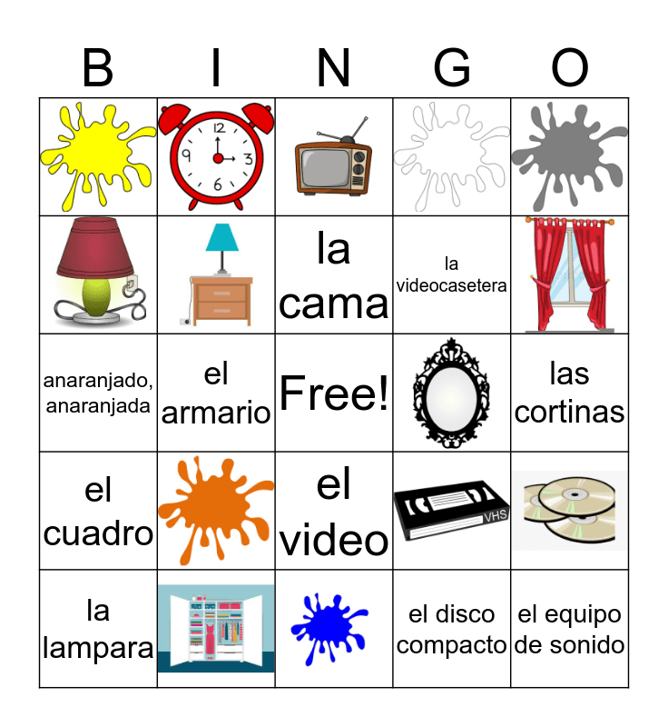 This bingo card has 24 images, a free space and 24 words: la alfombra, el armario, la cama, la comoda, las cortinas, el cuadro, el despertador, el dormitorio, el espejo, el estante, la lampara, la mesita, la pared, el disco compacto, el equipo de sonido, el lector DVD, el televisor, el video, la videocasetera, amarillo, amarilla, anaranjado, anaranjada, azul, blanco, blanca and gris.