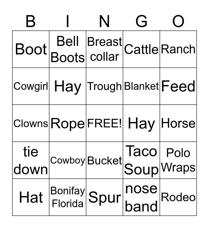 This bingo card has a free space and 24 words: Cowboy, Bonifay Florida, Trough, Hat, Ranch, Boot, Cowgirl, Bell Boots, Hay, Bucket, Blanket, Clowns, Taco Soup, Polo Wraps, Hay, nose band, Horse, Breast collar, Feed, Rope, Rodeo, tie down, Cattle and Spur.
