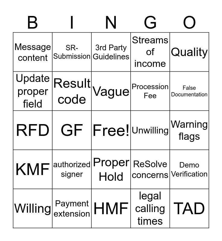 This bingo card has a free space and 24 words: Willing, authorized signer, Vague, legal calling times, Quality, Message content, SR-Submission, 3rd Party Guidelines, Unwilling, Warning flags, RFD, Result code, ReSolve concerns, Demo Verification, Update proper field, Payment extension, HMF, Streams of income, False Documentation, KMF, GF, Proper Hold, Procession Fee and TAD.