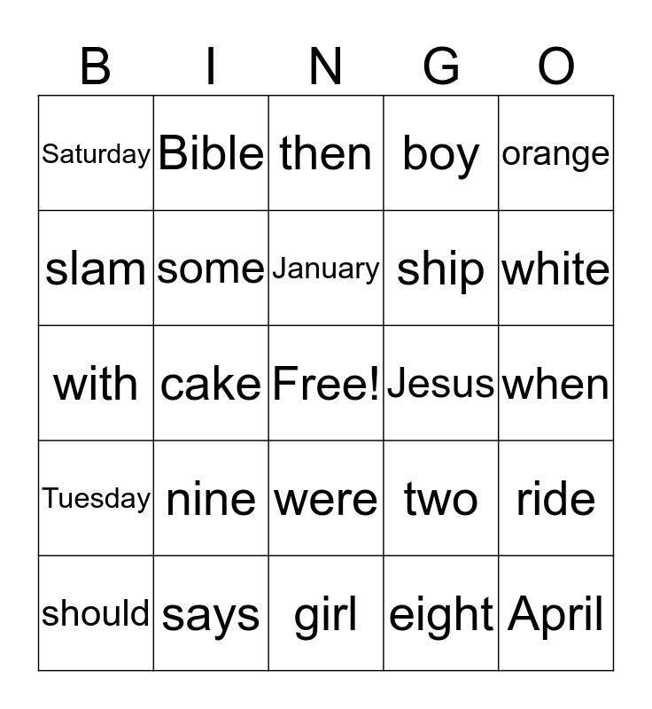 This bingo card has a free space and 34 words: God, eight, brown, Lord, Tuesday, some, orange, should, Bible, four, January, then, could, gray, Jesus, white, says, with, nine, two, were, would, Saturday, when, girl, April, boy, chop, ship, slam, hike, cake, ride and wash.