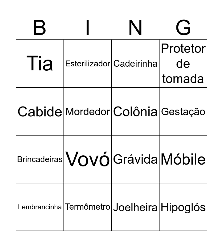 This bingo card has 92 words: Free!, Algodão, Amamentar, Amor, Aspirador nasal, Babador, Babá eletrônica, Banheira, Bebê, Berço, Body, Bolsa térmica, Boneca, Brincadeiras, Brinquedos, Cabide, Cadeirinha, Camiseta, Canguru, Canção de Ninar, Carrinho, Casaquinho, Chapeuzinho, Chocalho, Chupeta, Colônia, Condicionador, Copo, Cotonete, Creme hidratante, Culote, Engatinhar, Escova de cabelo, Esponja de banho, Esterilizador, Família, Felicidade, Fraldas, Gestação, Gorrinho, Grávida, Hipoglós, Joelheira, Leite, Lembrancinha, Lenços umedecidos, Lençól, Livro de histórias, Luvas, Macacão, Madrinha, Mamadeira, Mamãe, Manta, Maternidade, Meias, Mochila, Mordedor, Mosquiteiro, Móbile, Nascimento, Padrinho, Papai, Papinha, Pente, Pinça higiênica, Poltrona, Porta-chupeta, Porta-mamadeira, Pratinho, Prendedor de chupeta, Presentes, Protetor de tomada, Protetor Solar, Proteção, Pula-pula, Sabonete, Saboneteira, Shampoo, Talco, Tapete, Termômetro, Tia, Tio, Toalha, Travesseiro, Trocador, Ultrassom, Umidificador, Ursinho, Vovó and Vovô.