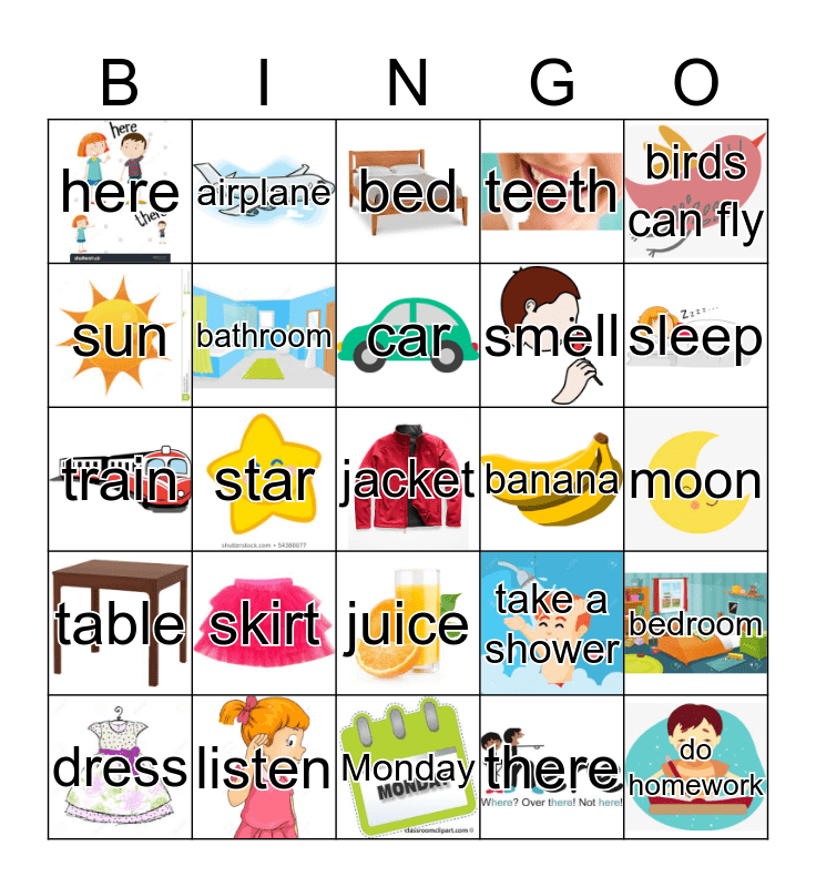 This bingo card has 24 images, a free space and 24 words: skirt, listen, car, dress, birds can fly, here, sun, airplane, banana, juice, smell, train, take a shower, bedroom, bathroom, there, moon, bed, sleep, star, do homework, table, teeth and Monday.