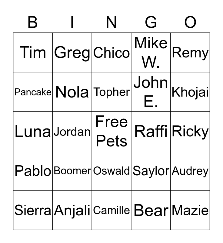 This bingo card has a free space and 24 words: Boomer, Anjali, Topher, Sierra, Remy, Tim, Pancake, Greg, Raffi, Oswald, John E., Luna, Saylor, Audrey, Nola, Bear, Ricky, Chico, Khojai, Jordan, Mazie, Pablo, Mike W. and Camille.