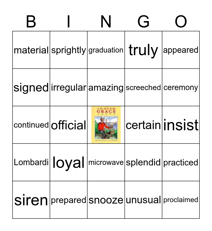 This bingo card has a free space and 24 words: loyal, prepared, amazing, siren, appeared, material, signed, sprightly, certain, microwave, screeched, continued, splendid, practiced, irregular, unusual, insist, graduation, ceremony, official, proclaimed, Lombardi, truly and snooze.