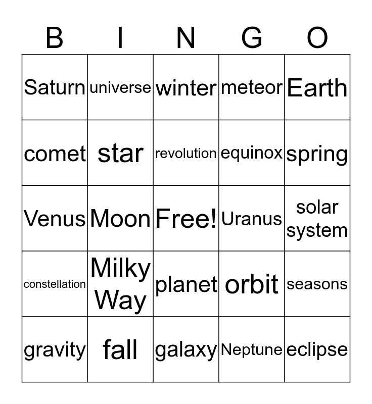 This bingo card has a free space and 35 words: Heliocentric, Geocentric, satellite, star, planet, meteor, comet, rotation, revolution, Mercury, Venus, Earth, Mars, Jupiter, Saturn, Uranus, Neptune, Moon, constellation, eclipse, orbit, gravity, seasons, fall, winter, spring, summer, solstice, equinox, solar system, Sun, galaxy, Milky Way, universe and light-year.