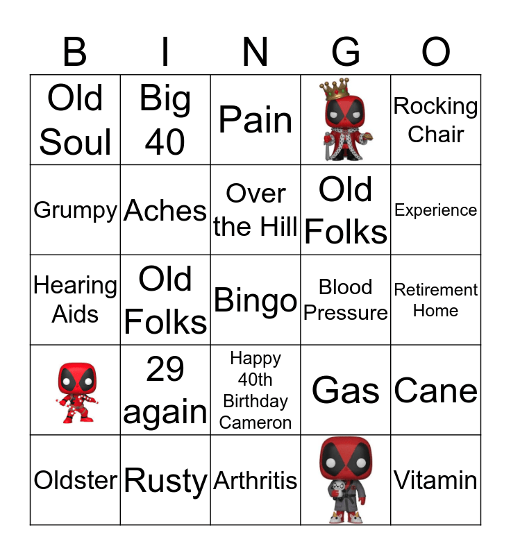 This bingo card has 3 images and 22 words: 29 again, Arthritis, Over the Hill, Oldster, Rocking Chair, Old Soul, Grumpy, Big 40, Blood Pressure, Happy 40th Birthday Cameron, Old Folks, Hearing Aids, Gas, Cane, Aches, Vitamin, Retirement Home, Pain, Experience, Old Folks, Bingo and Rusty.