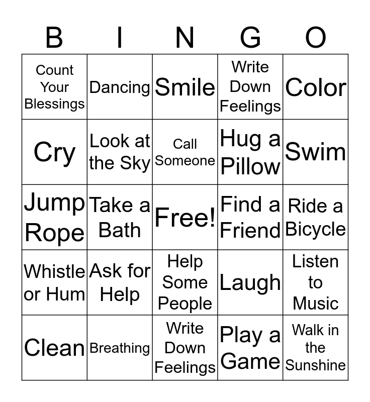 This bingo card has a free space and 24 words: Ask for Help, Breathing, Call Someone, Clean, Color, Count Your Blessings, Cry, Dancing, Find a Friend, Help Some People, Hug a Pillow, Jump Rope, Laugh, Listen to Music, Look at the Sky, Play a Game, Ride a Bicycle, Smile, Swim, Take a Bath, Walk in the Sunshine, Whistle or Hum, Write Down Feelings and Write Down Feelings.