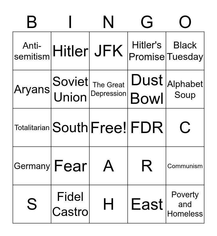 This bingo card has a free space and 24 words: S, Fear, The Great Depression, East, Black Tuesday, Anti-semitism, Hitler, JFK, FDR, C, Totalitarian, Soviet Union, R, Communism, Aryans, Fidel Castro, H, Hitler's Promise, Alphabet Soup, Germany, South, A, Dust Bowl and Poverty and Homeless.