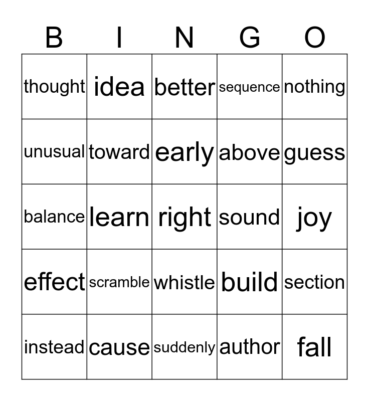 This bingo card has 25 words: scramble, suddenly, early, instead, nothing, thought, unusual, idea, sound, whistle, above, balance, build, section, toward, fall, joy, better, guess, learn, right, cause, effect, sequence and author.