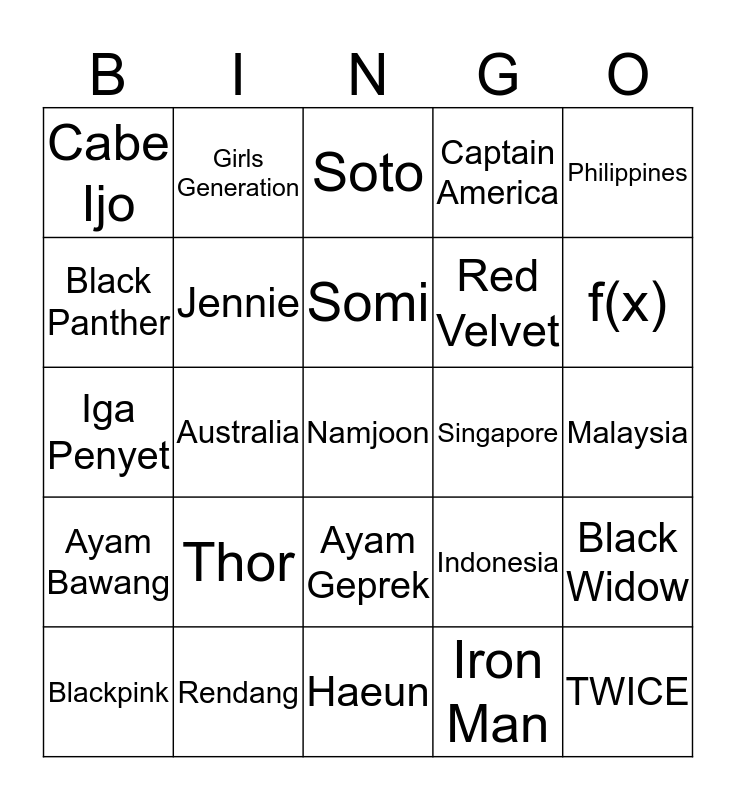 This bingo card has a free space and 24 words: Thor, Rendang, Somi, Blackpink, Philippines, Cabe Ijo, Black Panther, Girls Generation, Singapore, Ayam Geprek, Red Velvet, Iga Penyet, Indonesia, Black Widow, Jennie, Iron Man, Malaysia, Soto, f(x), Australia, TWICE, Ayam Bawang, Captain America and Haeun.